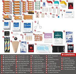 包括的なコンポーネント: 創傷ケア: 包帯、ガーゼパッド、粘着テープ、消毒用ワイプ