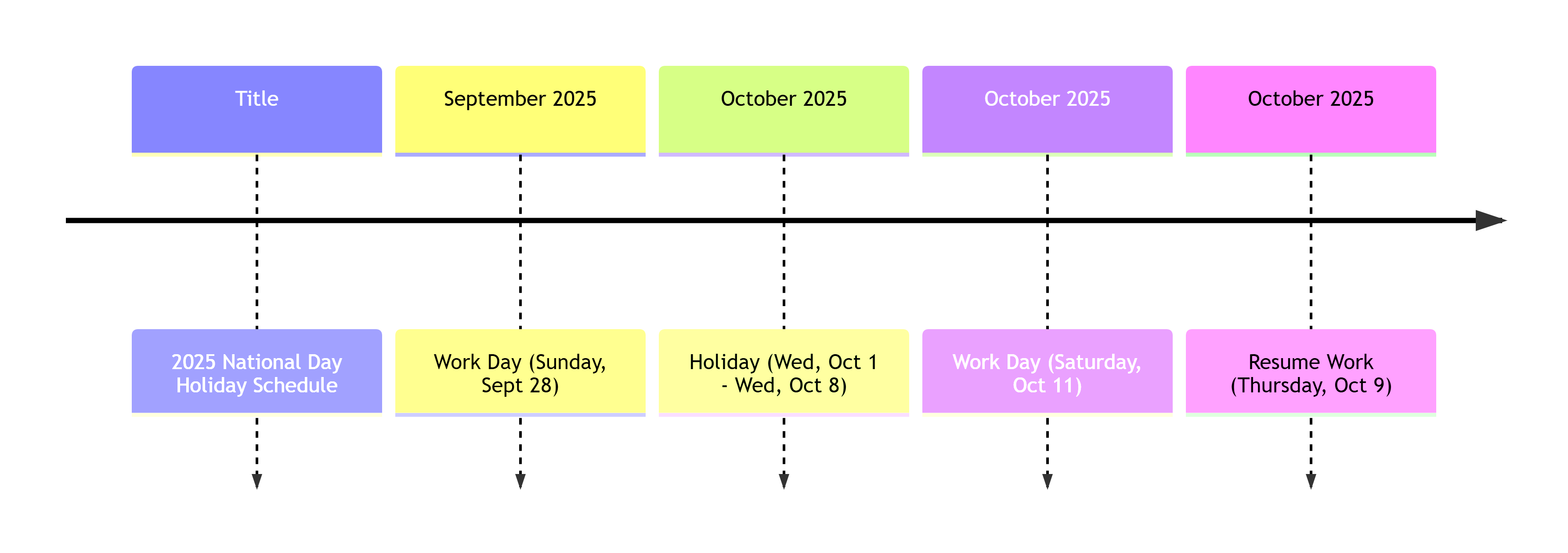 緊急でないすべてのメールやリクエストは、10 月 9 日にオフィスに戻ってから、受信した順に対応させていただきますので、ご了承ください。ご理解とご協力をお願いいたします。📌 ホリデー前の準備スムーズなワークフローを確保し、混乱を最小限に抑えるため、クライアントとパートナーには、ホリデーが始まる前に注文したり、緊急のリクエストを送信したりすることを検討することをお勧めします。社内の各部門は、出発前に重要なタスクを完了し、必要な安全対策を講じるよう勧告されています。 🎉 休日のご挨拶 今年の国慶節は中華人民共和国建国 76 周年を迎えます。中秋節と同時に行われるこの祭典は、家族の団欒と国家の誇りを育む特別な時期となります。